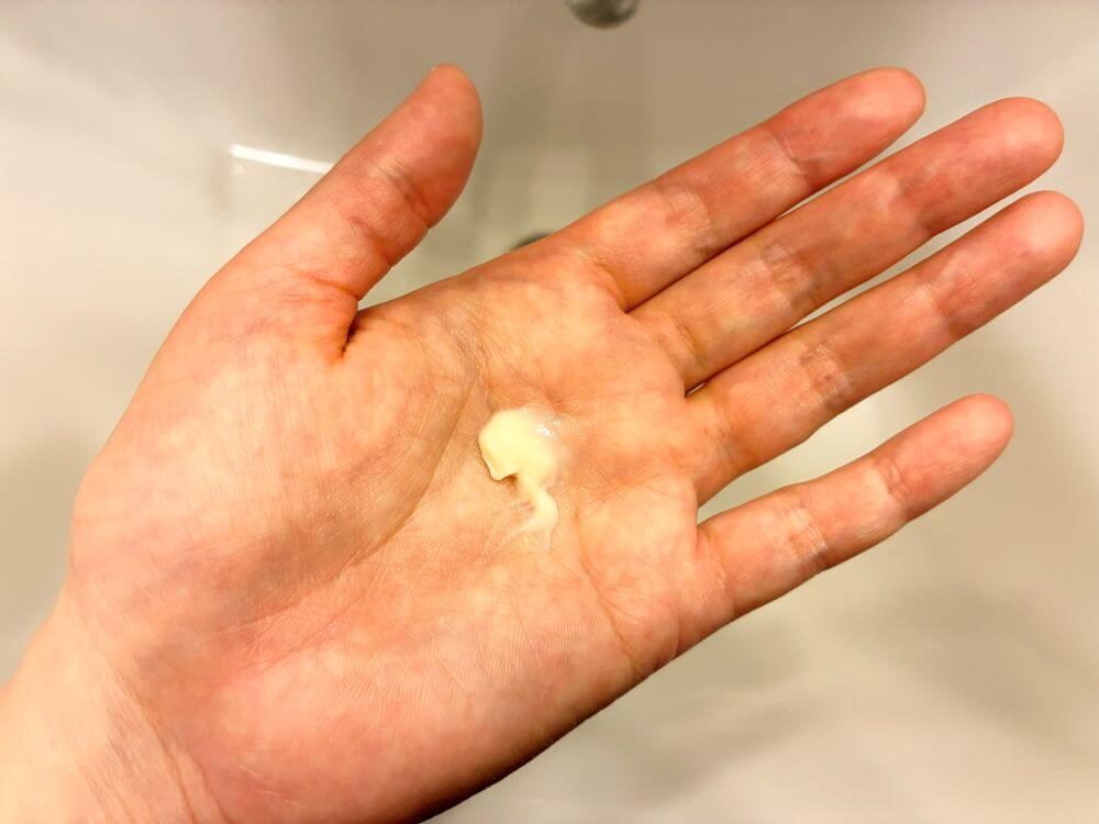 パール一個分を手に取り手のひらでなじませ、肌を手で包むように塗ります。